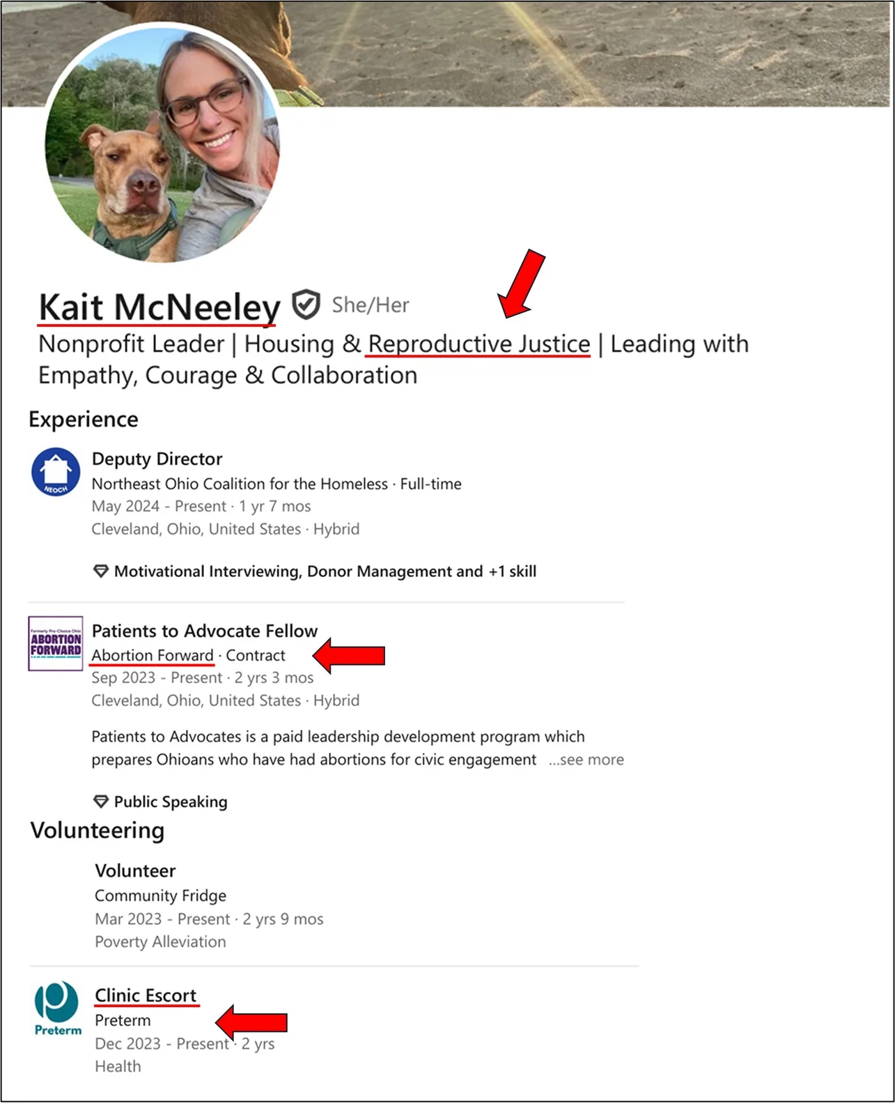 Additionally, McNeeley’s LinkedIn profile activities include support for abortion and LGBT ideologies – including as head of Northeast Ohio Coalition for the Homeless.