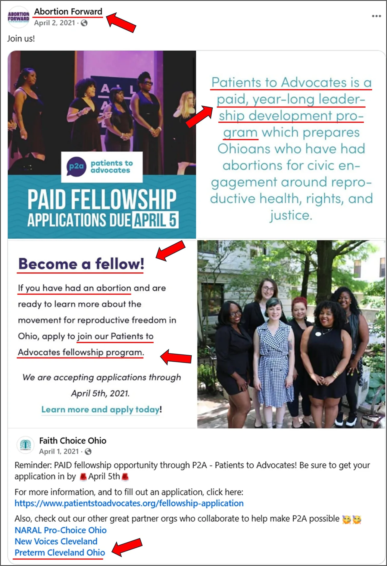 On April 2, 2021, Abortion Forward posted an advertisement for its Patients to Advocates (P2A) program, indicating that it is a “paid, year-long leadership development program” for women who have had an abortion and are looking to become advocates for abortion. Identified at the end of the ad is an indication that Preterm is a participant in the P2A program.