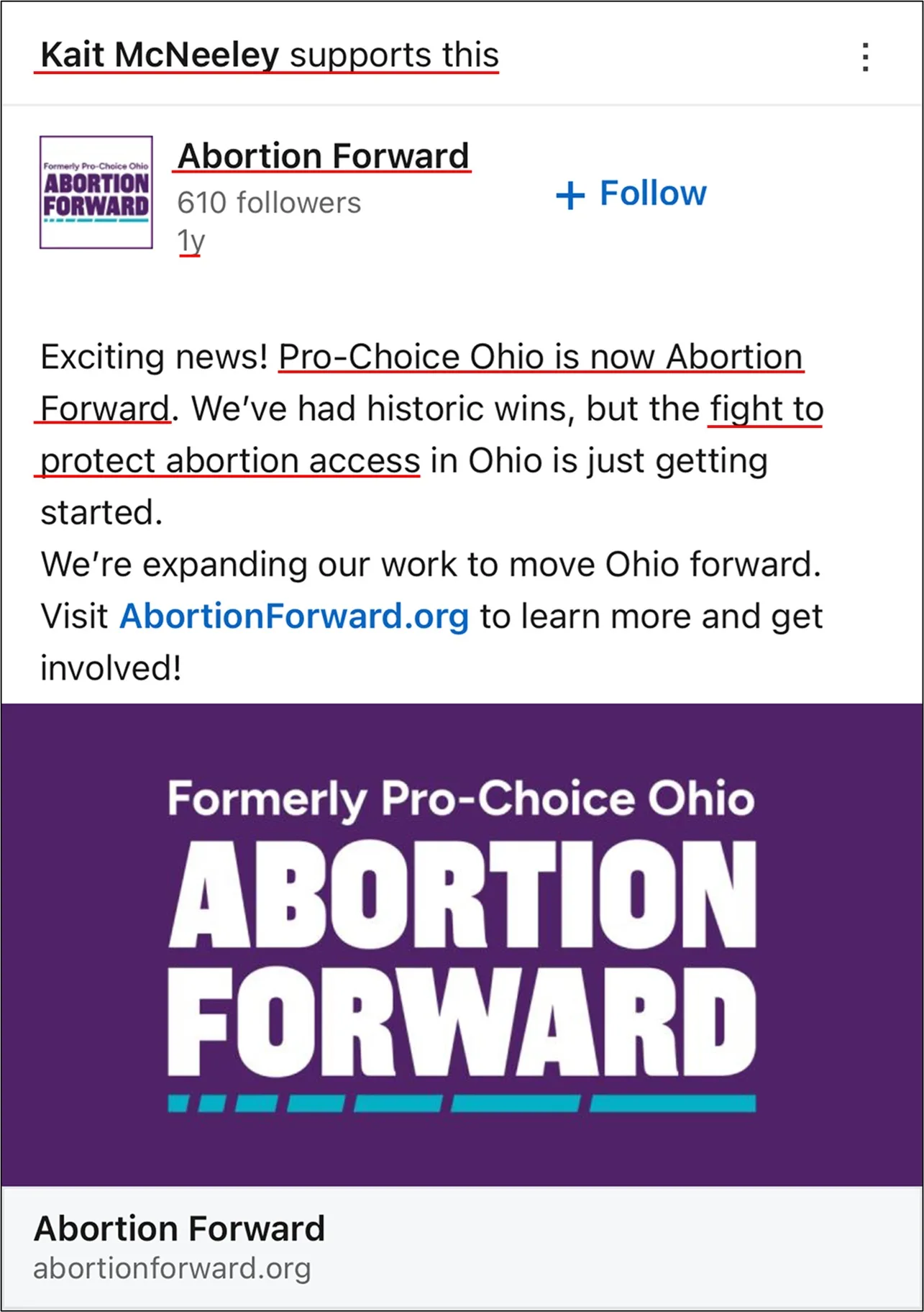 In 2024, McNeeley “supported” Abortion Forward’s post announcing its name change from “Pro-Choice Ohio,” while declaring it’s fight to maintain access to abortion.