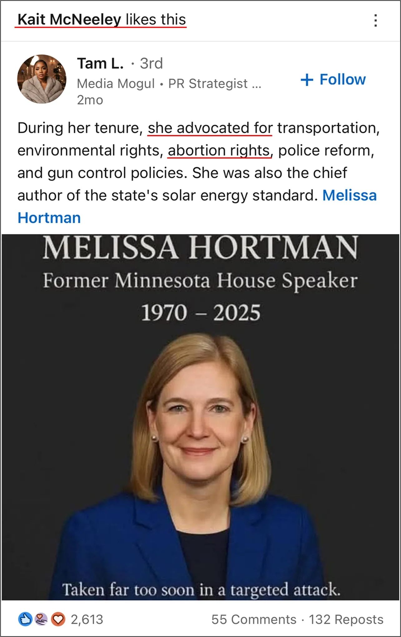 In September of 2025, McNeeley liked a post celebrating Melissa Hortman for her advocacy for abortion.